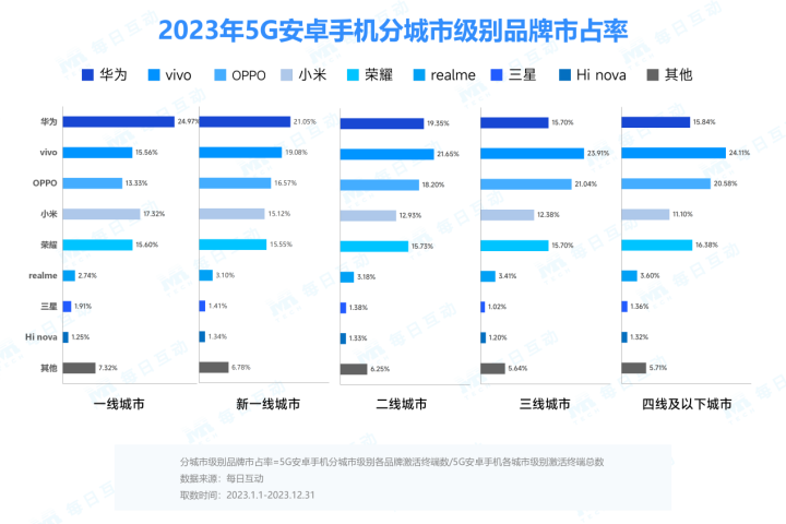 分城市级别看,vivo在二线、三线、四线及以下城市的品牌占比均处在领先位置;华为在一线、新一线城市市占率依旧保持第一位置,且占比较上一年度有所提升;小米在一线城市市占率排名上升,排在第二位。