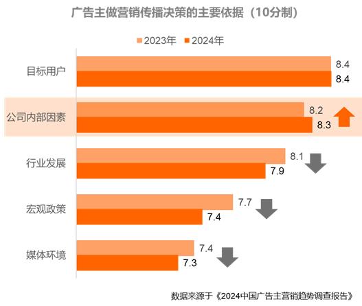 · 2024年,广告主提升了“公司内部因素”在营销传播决策中的重要性。同时,广告主的营销预算增长虽较为有限,但他们仍希望“要多办事,要好结果”,因此也愈加重视内部经营的优化提升,在定调年度营销主题词时,更倾向增强内生动力,加速“自驱性进化”。