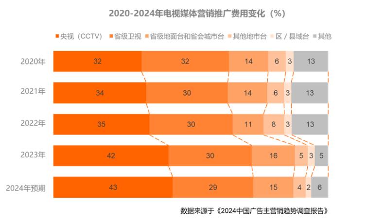 · 一是通过强影响力的电视媒体进行消费者触达和全产业链的战略级曝光,其中,央视发挥关键作用。近几年央视在电视媒体营销推广费用中的占比持续上升,已超四成。