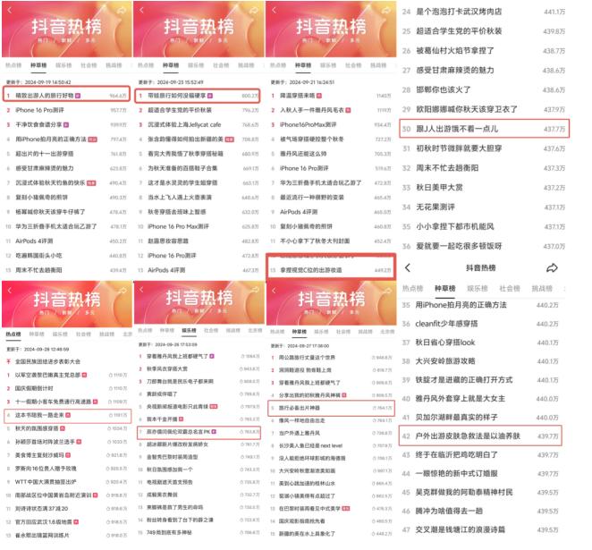 小马还发现,放假前这一个多星期,几乎每天都能在抖音热榜上看到别人出游怎么玩的话题。比如出游要想精致,行李箱里哪些东西是必不可少的,去旅行做什么样的妆造能100%出片……