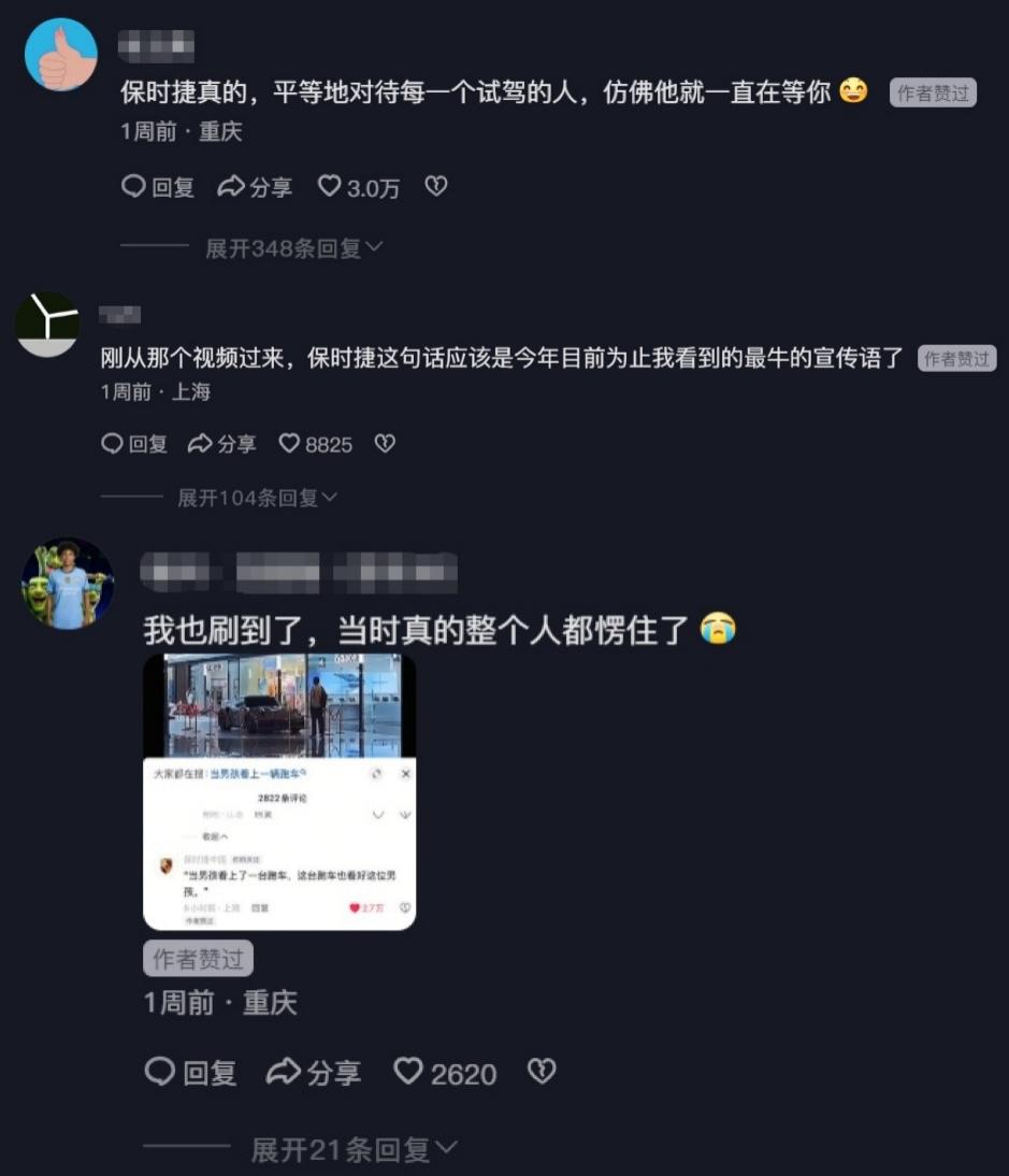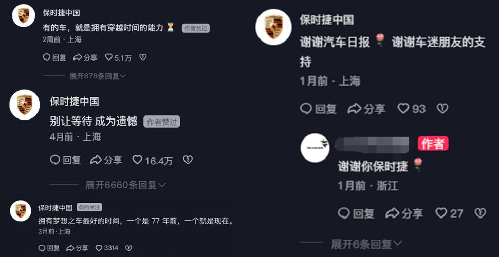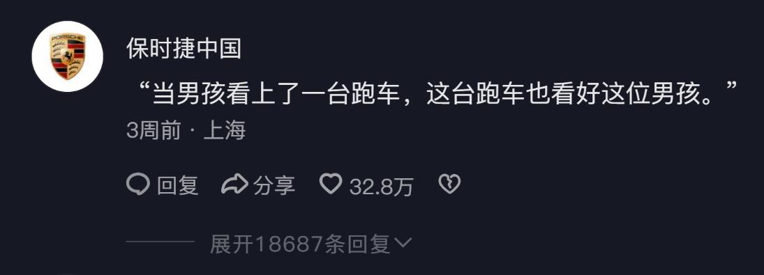 品牌精神传承:这一策略背后是保时捷对品牌基因的深度挖掘——从费利 · 保时捷先生"为梦想造车"的初心,到如今鼓励每个追梦人的品牌主张。在社交媒体互动中,团队始终秉持"梦想见证者"的人设定位:当男孩凝视保时捷的眼神被品牌看见,当普通人的奋斗故事获得官方点赞,保时捷正在用当代语言重新诠释 "为梦而驰" 的品牌哲学。这种有温度的人设建设,既延续了品牌75年的精神传承,又为"德国精密工程"注入了鲜活的中国式情感表达。