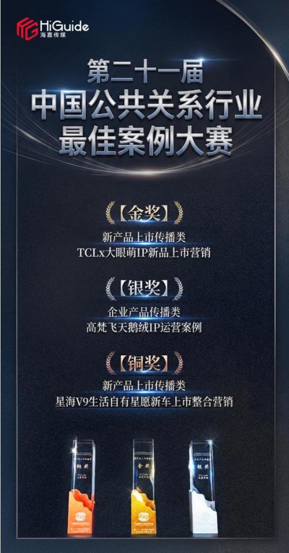 作为公关行业极具影响力的年度盛会,本届大赛金奖案例56个、银奖案例58个、铜奖37个。海嘉传媒荣获金奖、银奖、铜奖各1个:【TCL×大眼萌IP新品上市营销】荣获新产品上市传播类金奖,【高梵飞天鹅绒IP运营】荣获企业产品传播类银奖,【星海V9生活自有星愿新车上市整合营销】荣获新产品上市传播类铜奖。