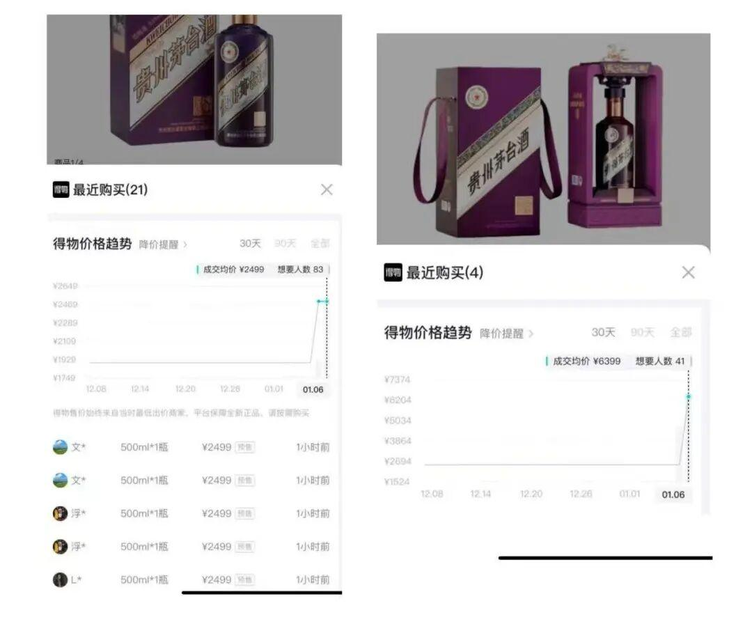 值得一提的是,得物App数据显示,2014年首个茅台马年生肖茅台已经成了“理财产品”;该产品在得物成交价为12735元,当时发售价仅为849元,溢价了14倍,相当于每年增长率超过100%。