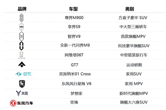 MPV赛道:本届车展有超过10款MPV新产品亮相,覆盖25万到60万不同区间。智界V9(鸿蒙智行首款MPV)、岚图珠峰(全球首搭L3级自动驾驶MPV)、东风风行星海V6(20-30万级家用MPV)、问道V9、零跑D99、第二代腾势D9等密集登场。MPV正从商务专属走向家庭多场景。