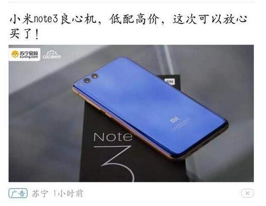 这是苏宁在今日头条投放的广告,在这则广告中苏宁称小米Note 3“低配高价”。图片被曝光之后,众网友纷纷怀疑这是PS的,表示小米Note 3的性价比虽然算不上无敌,但绝对跟“低配高价”扯不上关系。