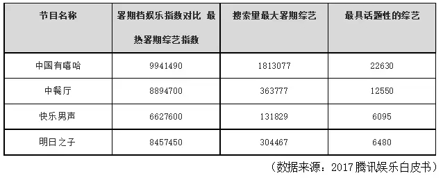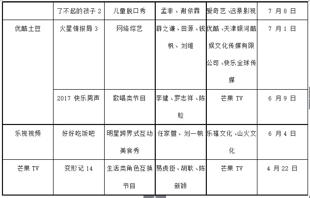 节目类型更加多元化。2017年前50位节目当中有14大类节目,音乐类与户外真人秀依然是最热门的两大类型。