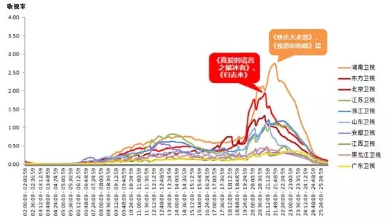 各卫视的全天收视曲线中,湖南卫视在21:30-22:30出现最高峰值,得益于《快乐大本营》和《我想和你唱第三季》的播出。东方卫视晚高峰值早于湖南卫视1个小时,出现在20:30-21:30,该时段热播电视剧《归去来》,说明东方卫视剧场收视突出,为频道总收视做出贡献。北京卫视晚间收视排第三,在20:30-21:30迎来全天收视高峰。