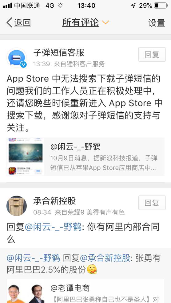 针对这一状况,目前老罗、锤子和快如科技还没有做出正式的回应,不过,子弹短信客服的微博账号在回复网友时表示“问题正在积极处理”,“子弹短信正在进行上架审核”。