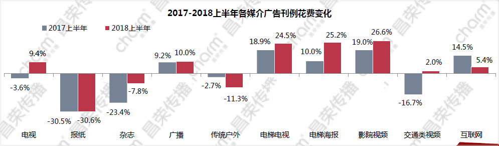 CTR广告主营销趋势调查结果显示,广告主对2018年中国整体经济运行状况,以及对行业和企业经营业绩的信心均比2017年有明显提升。纵观整个上半年,广告市场得益于宏观政策和世界杯等大事件的刺激,整体花费增幅高达9.3%。其中电视媒体广告花费增幅超过整体水平,广播媒体保持稳定增速;而与电视形成鲜明对比的是互联网媒体广告花费增幅放缓,同时报纸、杂志和传统户外广告花费增幅继续下降。
