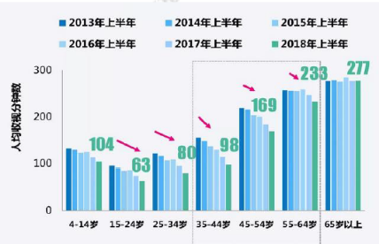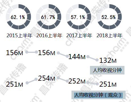 2018年上半年,全国平均每人每天收看电视132分钟,比2017年上半年少了12分钟,下降幅度为8.33%,是4年来下降幅度最大的一年;与2015年上半年相比,减少了24分钟,短短的4年间,人均看电视的时间整整缩短了近半个小时的时长。可见随着社交媒体,短视频等移动互联网的发展,人们的收视行为正在进一步被分流。