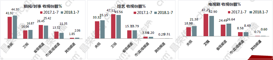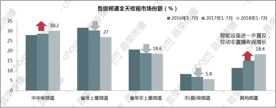 从各级频道近三年1-7月的收视份额来看,2018年央视市场份额连续三年稳增,并拉开了与卫视的距离,这是近三年来首次出现;而卫视频道和地面频道呈现连续下滑的态势,同时“其他频道”出现持续上升也说明智能设备的普及率提升催化更多的回看和点播行为。