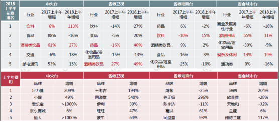 从广告的行业花费来看,央视卫视上半年增幅明显的是主要集中在快消品类,如饮料,食品等,受到世界杯等大事件的影响,央视上半年饮料行业花费增幅显著;卫视方面增幅明显的有酒精类饮品、药品等行业;从品牌上来看,足力健,小罐,君乐宝,京东商城,恒大在央视的投放费用增幅最明显,卫视方面,王老吉,同仁堂,伊利,旺旺,蒙牛则处于投放增幅TOP5地位。
