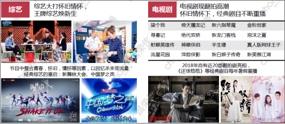 今年综艺市场也呈现多个经典综艺重新开启的局面,如《中国梦之声》和《新舞林大会》再次重出江湖。与此同时,电视剧方面也表现出浓重的“怀旧”特色,如经典电视剧不断地重拍与翻拍,《西游记》、《新白娘子传奇》、《还珠格格》等经典剧一直是寒暑假必备的高收视剧集,据悉,2018年将近有20部经典剧的翻拍。