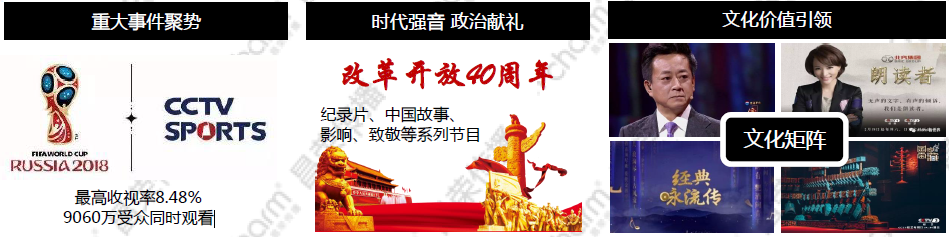 同时,央视通过台网融合与创新,用社交、互动、科技不断地吸引年轻观众,其独断的稀缺资源形成大IP聚势效应,让品牌全面收获名利场,如刚刚结束的世界杯不仅仅是受众的聚会,更是品牌的聚会。