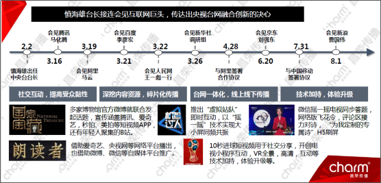 而为了进一步推进广电“从相“加”阶段迈向相“融”阶段”。今年中国国际电视总公司与阿里巴巴集团签订技术合作协议,双方将在云平台、大数据、移动客户端、信息化平台建设等方面进行合作。6月,今日头条宣布与湖南卫视、北京卫视、东方卫视、江苏卫视、浙江卫视五大卫视开启战略合作,未来将在综艺、影视项目宣推、短视频联合出品等领域进行深入探索。