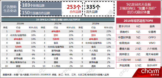 今年前四个月,五大卫视广告赞助出现了一定的更新换代,一共有253个合作品牌,其中新增品牌103个,连续合作的品牌有150个,但流失品牌高达335个。