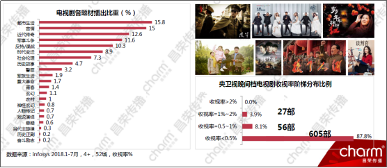与前两年的剧集喧闹相比,今年电视剧市场呈现乏善可陈的态势。随着市场监管的力度加大,加上《如懿传》等大IP古装剧的不断延期,2018年上半年现实题材类剧集得到了巨大的市场空间,都市生活、言情、近代传奇、军事斗争、反特谍战播出量都超过10%,TOP大剧中包含了都市、职场剧、历史剧、农村剧、现实题材及谍战剧。虽然剧目题材丰富,但热点分散,在古装大剧缺席的前提下,无论是话题型大剧还是收视率爆款型IP剧均未在上半年出现,其中近88%的剧集收视率低于0.5%,也许大多数人对于上一部爆款电视剧的印象似乎还停留在《人民的名义》。另外从播出平台来看,电视剧集TOP10的排名中,央视占据6席,北京卫视与东方卫视成为卫视平台的赢家。
