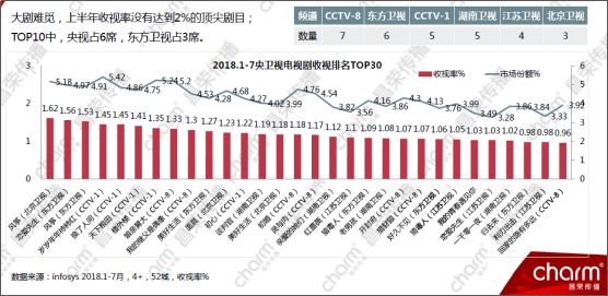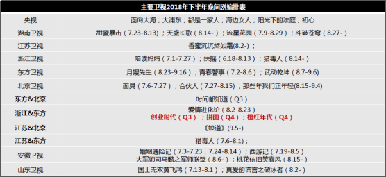 从目前公布的下半年晚间剧集编排来看,作为引领主流价值的央视平台,央视下半年以主旋律大剧为主,而作为独播剧的核心阵地——湖南卫视继续以独播剧为主,浙江卫视以及东方卫视编排多部主旋律剧集献礼改革开放四十年。