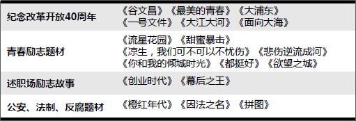 为响应政策号召,总局“百部规划”出台,未来4年的百部重点剧目紧紧围绕庆祝改革开放40周年、中华人民共和国成立70周年、全面建成小康社会、建党100周年等党和国家重大宣传期和宣传节点开展编播,确保推出一批聚焦改革开放大时代,展现改革开放40年尤其是党的十八大以来取得的重大成就,表现普通百姓在改革大潮中勇于创新拼搏、创造美好生活的精品力作,向改革开放40周年致敬,同时亦兼顾其它题材剧集。