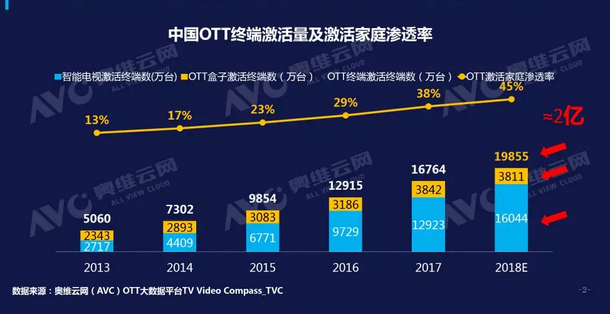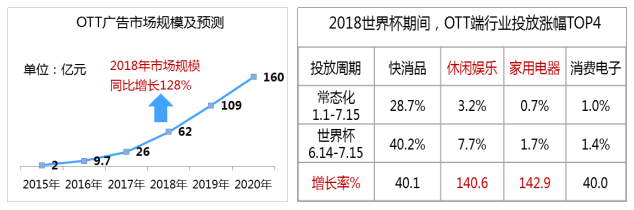 随着OTT终端整个产业链日渐完善,其市场前景不断走高,据奥维云网预计,2018年国内OTT终端激活总数近2亿台,渗透家庭达到了45%。同时国家监管部门也加大规范力度,今年国家广电总局颁布第181号文件提出:世界杯期间,暂不开展广播电视节目直播类服务。同年“OTT广告联盟”正式成立,预示着针对OTT广告投放标准、广告流量标准等行业行为准则的进一步规范化。