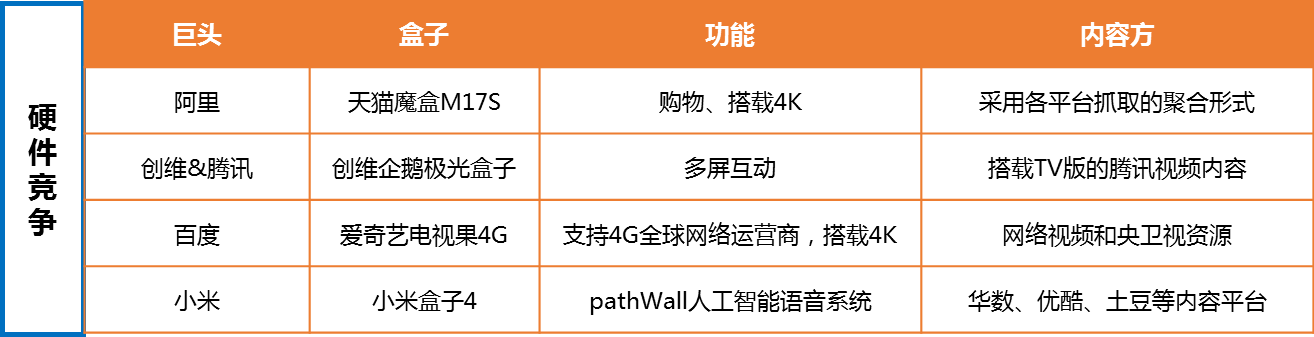 经过多年的深耕,OTT市场的商业闭环已经基本形成,作为大屏电视入口,硬件终端的市场竞争最为激烈。近几年BAT借助各自独特的技术实力不断地提升硬件的先发优势,人工智能、多屏互动,VR/AR游戏体验等新技术成为竞争重点。而OTT技术升级也带来了更多的营销价值,成为BAT生态战略布局的重要砝码。