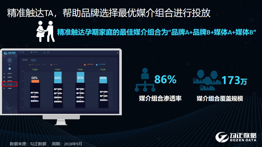 洞察:如何触达消费者,解决受众不清楚的痛点。第一步要识别目标精准受众,对于受众画像,普遍认知是由性别、年龄、收入等基础人口属性定义,但是勾正数据所描述的大屏消费者画像,更符合互联网环境,具有全面、个性、成长性等优势。比如我们定义孕中以及0-12岁的家庭户为亲子社群,再以消费特征、用户使用行为维度进一步细分,包含孕期、婴儿、幼儿、学龄前、学龄中,依据全面、丰富的消费者画像,可以支持母婴亲子类广告主,精准洞察哪些是它的目标消费群体,这也是勾正数据OTT全链路营销解决方案的第一步,也是勾正睛准(Gozen Insight)的主要功能,可以为广告主洞察用户需求,深入感知用户偏好,提供OTT/TV精准营销决策参考,有效调整营销策略。