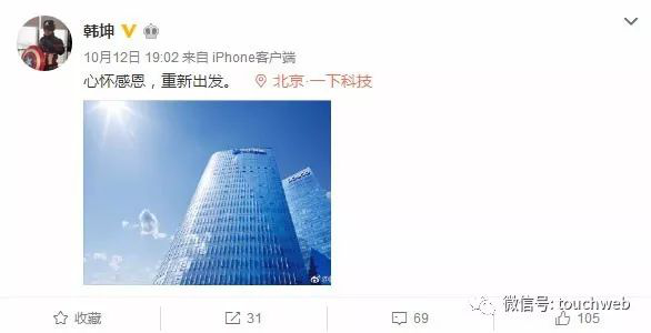 同时,韩坤还发微博感概道:“心怀感恩,重新出发”。