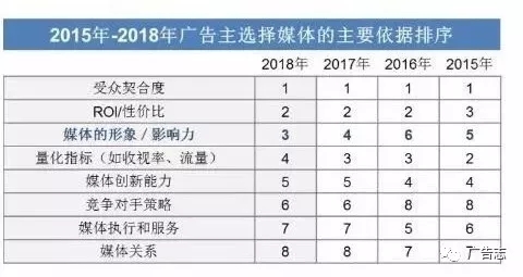 此外,媒体的影响力因素越来越重要,CTR调查结果显示,媒体形象和影响力在广告主对选择媒体依据的排序从2016年的第6位上升至2018年的第3位。这说明企业在选择与目标受众匹配的平台的同时,对媒体所投射出的品牌形象和信誉更为看重,而权威、影响力大的媒体无疑对企业形象有更正面的塑造效果。