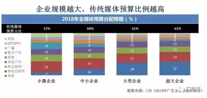 对于电视媒体来说,大型企业的广告投放需求增多成为了有利趋势。调查结果表明,企业规模越大,在电视媒体上投放广告的预期也越高。超大企业和大型企业2018年全媒体预算分配预期,均是电视占比最高,分别为32%和29%,明显高于其他媒体类型。
