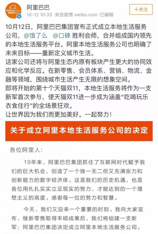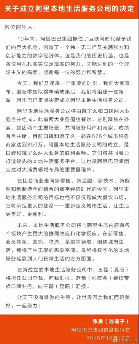 而整合百度外卖,是阿里巴巴在新成立本地生活服务公司后的第一个大动作。10月12日,阿里巴巴集团CEO张勇向员工发信称,宣布成立阿里本地生活服务公司。
