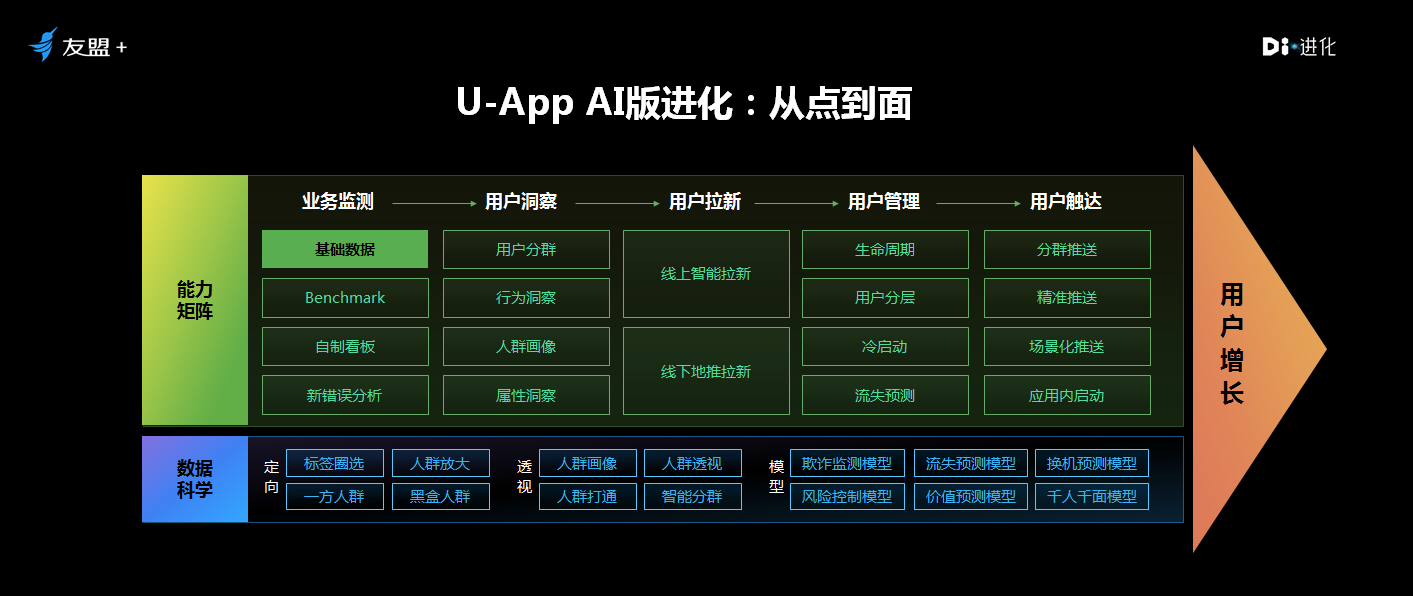 种种进化升级的背后,离不开友盟+八年来对大数据的沉淀和积累,正是因为有了这些丰富的数据基础以及全域数据能力,才使得友盟+能够在更多行业、更多产品、更多业务的场景中,拥有持续升级进化的能力和基因。