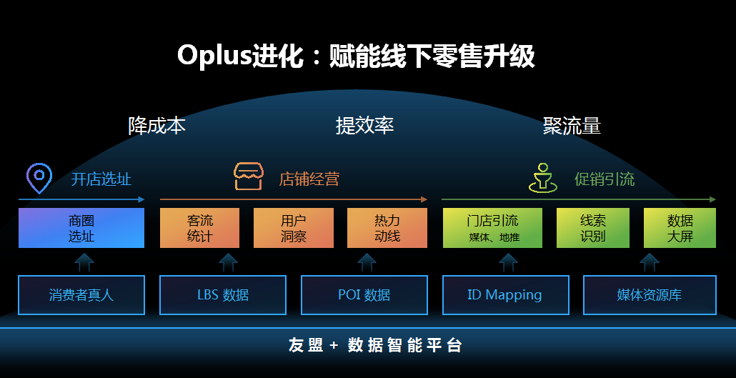 在线下零售市场,友盟+围绕“降成本、提效率、聚流量”三大目标提供数据服务。朋新宇说,线下的很多运营模式与线上完全不一样,“我们把友盟+对数据、对行业、对人群的理解,通过数据智能平台赋予Oplus,并应用在智能商圈选址、潜客引流等场景中,这相比传统的数据模式,都有了质的进化。”