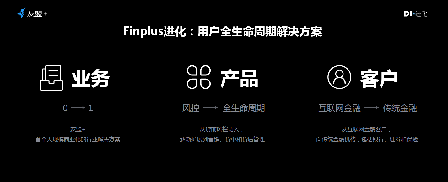 此外在金融行业,友盟+还推出了首个大规模商业化的行业解决方案“Finplus”。在过去一年半的时间内,“Finplus”在业务上实现了从0到1的突破,在产品上完成从单一风控到全生命周期的升级,服务的客户也已从互联网金融客户扩展到更多传统金融领域。