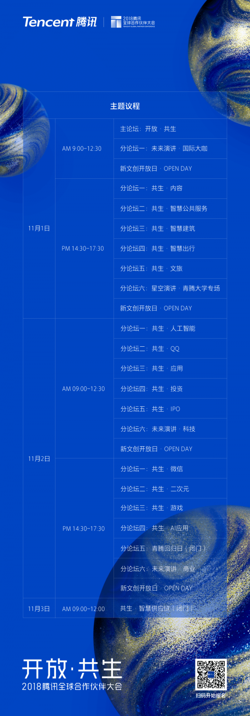 今年是腾讯成立20周年,腾讯各业务线也将在大会上一一亮相。包括微信、QQ、腾讯云、腾讯开放平台、腾讯企鹅号、腾讯应用宝、腾讯AI Lab、腾讯车联、腾讯自动驾驶、腾讯微瓴互联、腾讯动漫等业务将集体登台,与合作伙伴分享最新战略方向与业务动态。
