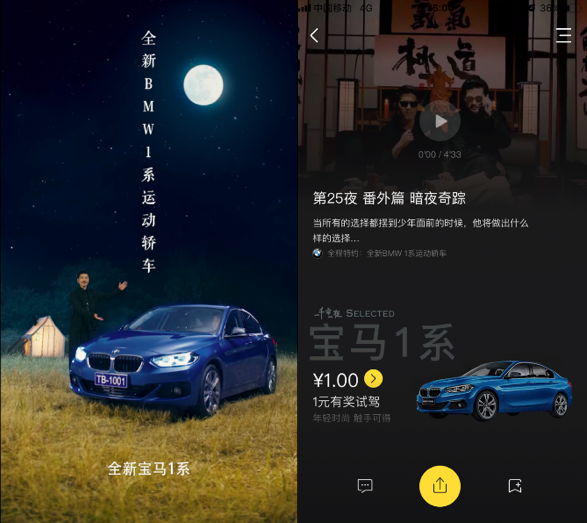 让内容成为消费的一部分,是此次宝马携手淘宝二楼的重要课题。双方将全新BMW1系作为推动剧情发展的关键道具,定制了角色和原生广告,并在番外剧中讲述了一个年轻人用41000元拥有梦想爱车的故事。
