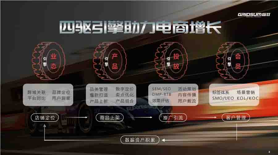 随后,李峰还具体介绍了国双在电商领域的增长探索,他表示,“近些年,人们日益习惯以网购方式采买各类商品,越来越多的企业加入到电商大军中,希望获取更多业务增长机会,但企业在电商运营上却面临着高营销投入低回报率、在平台没有话语权、缺少电商运营指导等诸多问题。为了帮助企业应对这些挑战,国双基于大数据平台独有的分布式数据架构和先进的实时、多维度关联性分析技术,对影响电商增长的众多因素进行了细分与剖析,提出了助力企业电商增长的四驱引擎模型,即业态引擎、产品引擎、投放引擎和会员引擎。四大引擎不仅契合了电商“店铺定位”、“商品上架”、“推广引流”和“客户管理”的运营管理流程,而且通过持续不断的数据积累和研究,反向驱动业态引擎,形成一站式电商营销闭环,为企业电商的复合型增长提供持续动力。”