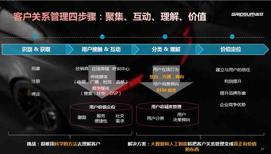 最后,国双商业事业群汽车事业部售前总监顾逸韬为现场嘉宾具体展示了国双在智能CRM领域的探索,并与现场嘉宾互动。顾逸韬认为,随着人口红利的稀释,企业在抢夺增量的前提下,还要注重盘活存量。无论是在汽车、美妆、母婴等领域,KOL的推荐对销售的拉动越来越重要。广告是块敲门砖,企业还要更多地关注口碑,管理和维护客户关系。他提到,“客户关系管理主要分为四个步骤,即聚集、互动、理解和价值;其中,聚集和互动两个环节,多数品牌已有触及,更多企业主要卡在了第二步向第三步的跨越上;而大数据和人工智能的应用,可以帮助企业对现有客户进行分类和深度理解,从而把客户关系管理变成真正有价值的服务和产品”。在智能管理方面,国双已实现多系统整合、自动化营销、用户数据库管理,可以帮助企业提升效率、优化效果、创造收益。