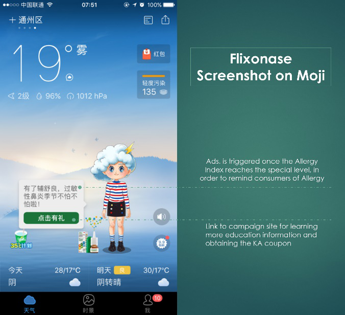 葛兰素史克“辅舒良过敏指数监测”创意案例由竞立媒体中国与辅舒良联手天气类排名第一的手机应用——“墨迹天气”共同打造,为消费者提供过敏原水平的实时更新,并告诉消费者引起鼻部过敏的真正原因,并非大家通常所认为的——鼻部过敏是由空气污染而不是由天气造成的。