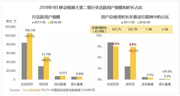 首先,短视频的用户使用时长已逼近长视频。QuestMobile最近发布的《2018秋季中国移动互联实力价值榜 》显示,到2018年9月,用户对短视频APP行业的总使用时长在移动互联网中占比8.8%,与长视频9.0%的比例已经相差无几。