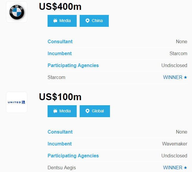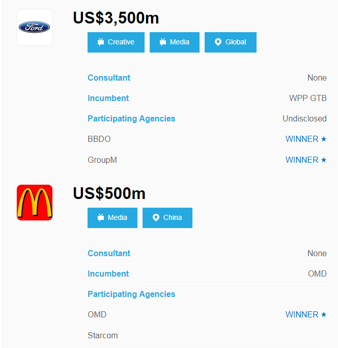 麦当劳(McDonald's)和宝马汽车(BMW)也在近期召集了中国区媒介业务比稿。最终,浩腾媒体(OMD)赢得了麦当劳(McDonald's)的业务。阳狮媒体旗下的星传媒体(Starcom)成功获得宝马汽车(BMW)的中国区媒介业务。