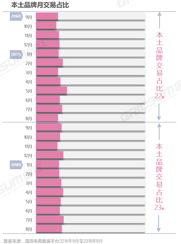 在电商渠道,本土品牌婴幼儿奶粉的交易占整体婴幼儿奶粉的22%-23%,在近两年内的份额提升非常有限。