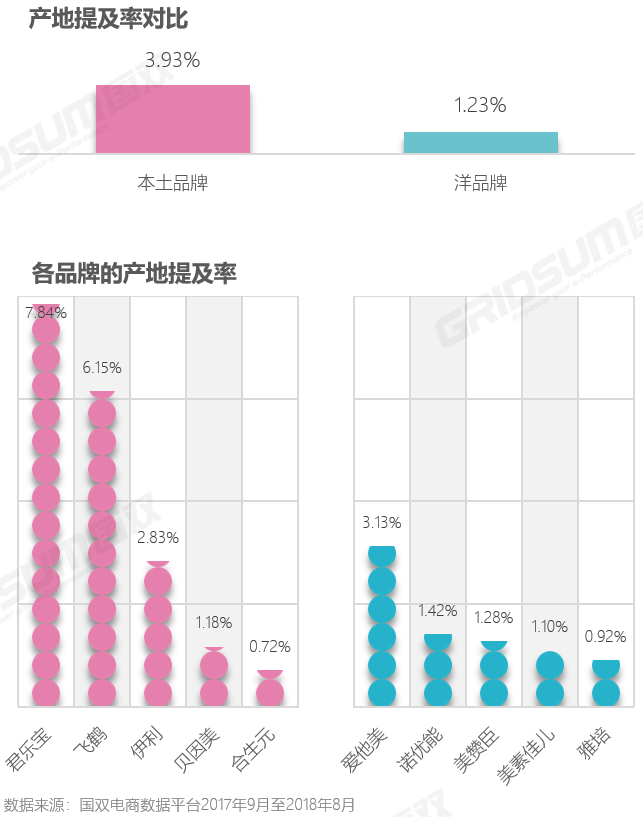 本土品牌中“君乐宝”、“飞鹤”的产地提及率很高,确实有一些本土品牌奶粉的忠粉,他们相信本土奶源的质量,相信本土奶粉更适合中国宝宝体质。