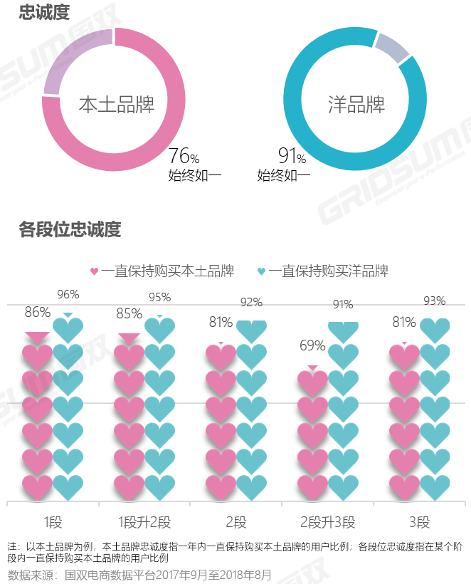 在各段位内看忠诚度时,本土品牌和洋品牌都是在1段及1段升2段时,忠诚度较高,但从2段开始,忠诚度下降,尤其是本土品牌用户在2段升3段时,忠诚度最低,超过30%的用户转向购买洋品牌。