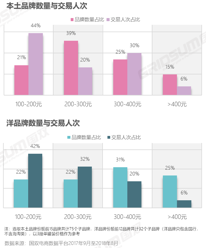 本土品牌零售价在100-200元(按每900克计算)区间的人次比例最高,体现了大众消费,排在第二的是300-400元的高端产品,非常明显的体现出本土品牌用户的两极分化,一方注重性价比,而另一方价格敏感度低,更注重品质。200-300元的供应品种最多,但销量反而不尽人意。洋品牌随着零售价格提升交易人次逐渐降低,消费更加理性健康。