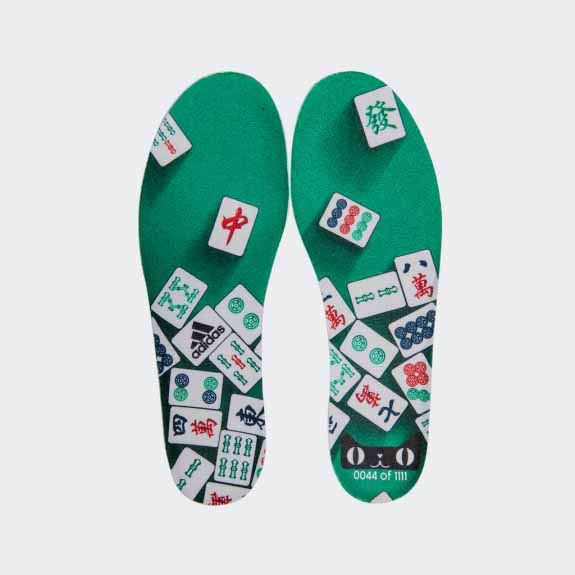 “北京鞋”灵感来自故宫,所以用了黑色、红色和金色,“广州鞋”则用广州地道美食小吃做灵感,配色选了肠粉、烧麦、虾饺的面粉白、橙色和浅灰色。有意思的要算“成都鞋”,用麻将为设计灵感,鞋面是纯白,鞋舌是绿色,鞋垫的印花铺上真麻将。