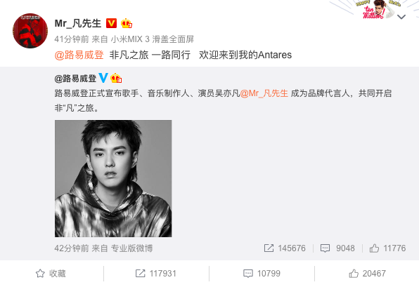 近日,路易威登官方宣布吴亦凡为最新品牌代言人,并配文:路易威登正式宣布歌手、音乐制作人、演员吴亦凡@Mr_凡先生 成为品牌代言人,共同开启非“凡”之旅。随后吴亦凡也转发其微博表示:非凡之旅一路同行欢迎来到我的Antares。这也是品牌史上首次正式官宣亚洲代言人。而早在2016年,吴亦凡就曾为奢侈品牌 Burberry 以及宝格丽代言,Burberry合约8月刚刚结束,便无缝接LV。