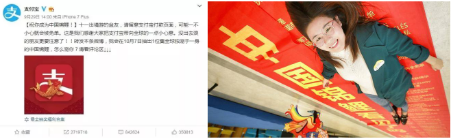 国庆节,就在大家旅游、宅吃的时候,支付宝干了一件大事——转发支付宝的“祝你成为中国锦鲤”的微博,支付宝将会抽出一位集全球独宠于一身的幸运者,领取一份超级大礼包。10月7日,支付宝宣布了这个“中国锦鲤”获得者--@信小呆,一瞬间微博炸了,整场营销活动达到了最高潮。“中国锦鲤”本人@信小呆获奖后发布了一则微博,由此涨粉数十万,目前粉丝已超60万。