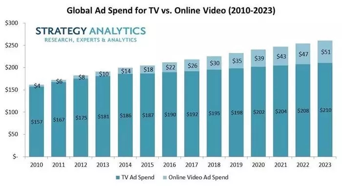 Strategy Analytics最新发布的研究报告《全球广告预测:2010-2023年》指出,大多数针对提高品牌知名度的广告预算继续优先考虑线性电视优先于在线视频。该研究指出,主要广告商已将广告支出从数字广告转向电视、音频和电子商务。
