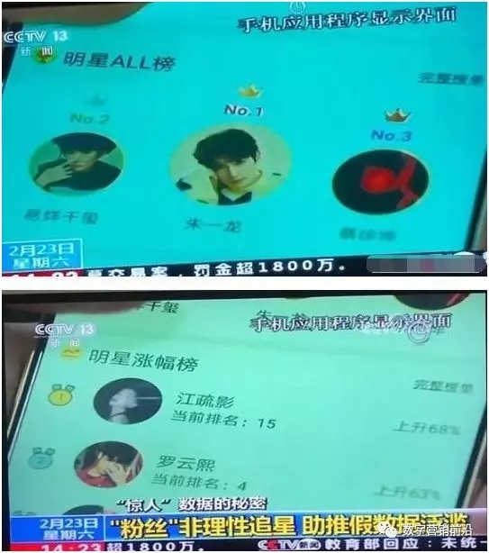 水军行业泛滥,致使众多明星加入假数据争相成为流量王,所以“打假”也必然会出现!2月23日下午,央视13套新闻频道,以“惊人”数据的秘密为主题,重点说明了“粉丝”非理性追星,助推假数据泛滥。只是打着“爱”的旗号为爱豆和偶像在,制造假流量作弊这方面推波助澜,而这些不正常的流量造就了不健康的产业链。而央视新闻也直接给出了几个例子,艺人1至艺人8,分别记录了流量明星相关数据脱水前和脱水后的具体对比,从榜单的数据中我们可以看出,这8位流量明星数据相当的高,最令人震惊的则是脱水后,显示的造假比例居然高达80%,虽然央视新闻并没有曝光这8位艺人的姓名,但也在这份名单之外,以截图的方式对一些流量明星进行“点名”!