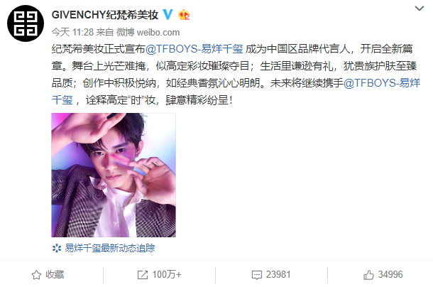早在去年十月份,易烊千玺就成已经是纪梵希美妆的彩妆代言人。不到半年代言升级,易烊千玺成为了纪梵希美妆的中国区品牌代言人。